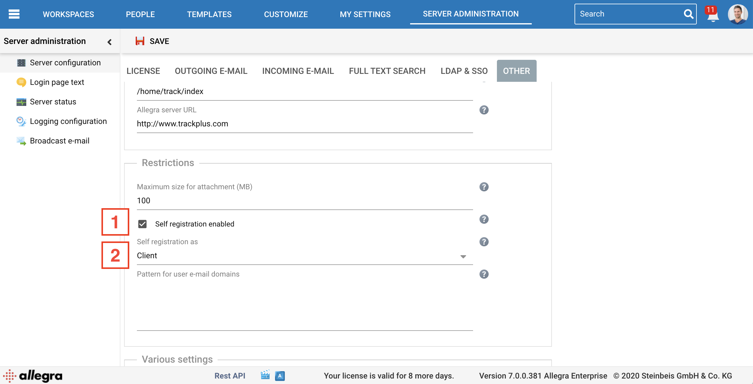 You can allow users to register themselves. You can choose how users should be registered, as customers or normal users. You can also limit the size of attachments here. Please note that self-registered users still need to be activated by an administrator after registration, unless you create a group to which they are automatically assigned.