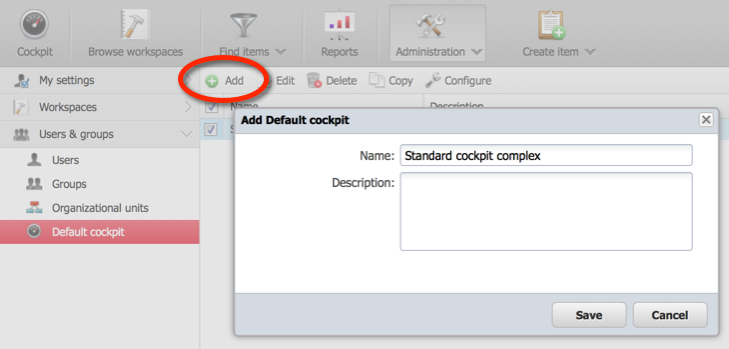 Klicken Sie in der kleinen Symbolleiste auf „Hinzufügen“ und geben Sie der neuen Cockpit-Vorlage einen Namen und optional eine Beschreibung.