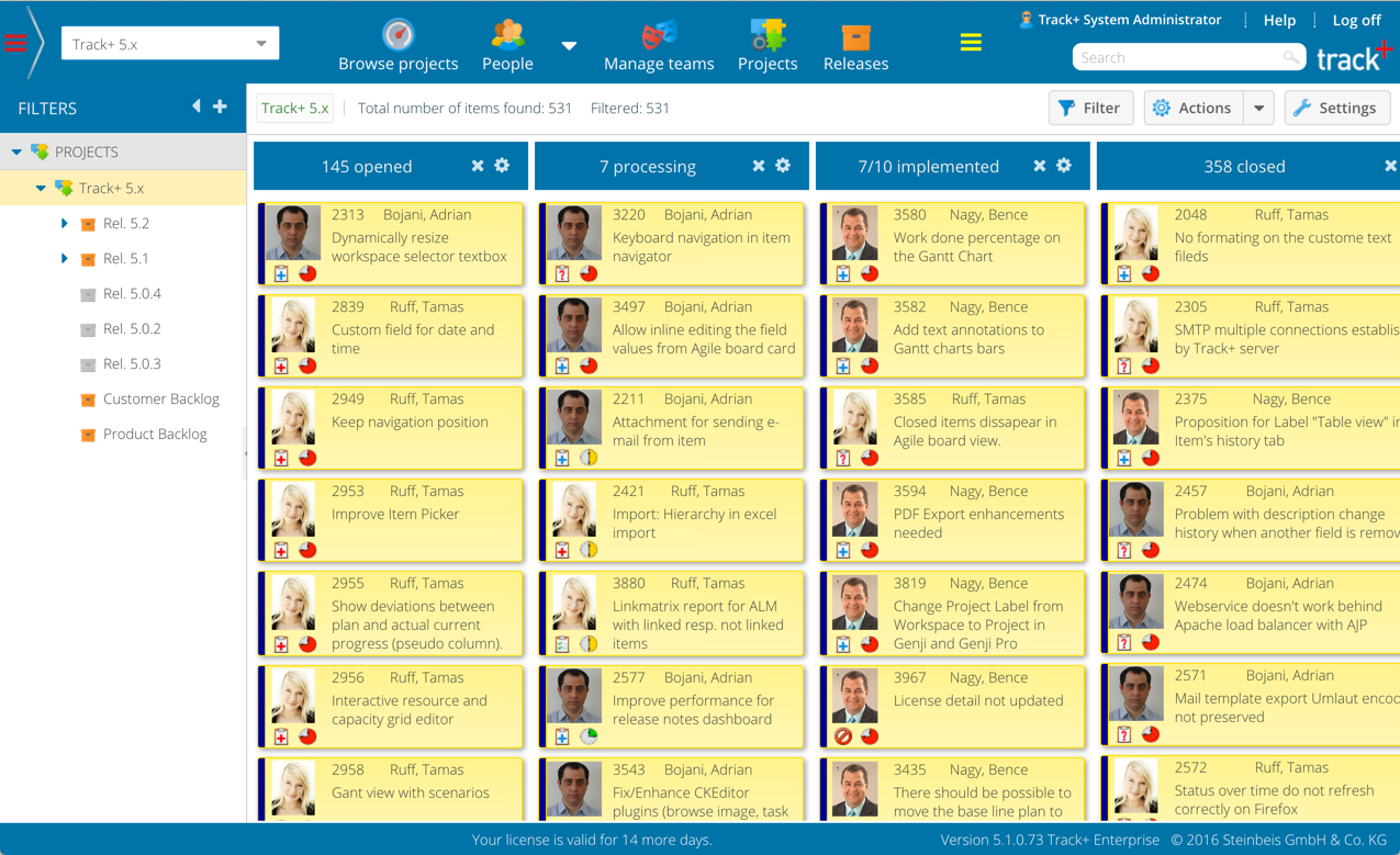 Das Tsk-Board präsentiert Vorgänge intuitiv. Mit Drag-and-Drop können Sie verantwortliche Personen, Status, Priorität und vieles mehr ändern.