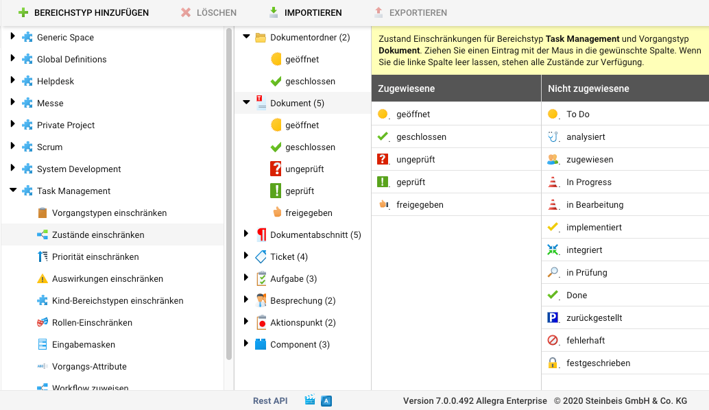 Ziehen Sie die Zustände, die Sie zuordnen möchten, von der rechten Spalte in die linke Spalte. Ist die linke Liste leer, stehen alle Zustände zur Verfügung.