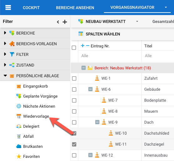 ziehen Sie ihn Vorgangsübersicht auf Persönliche Ablage> Wiedervorlage.