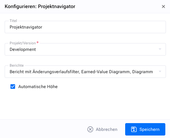 The Project Navigator requires no configuration when used within a project or release cockpit. When used in the general cockpit, it requires the selection of a project and/or a release. In any case, you can select the reports you want to link from the list of all reports available in the system.