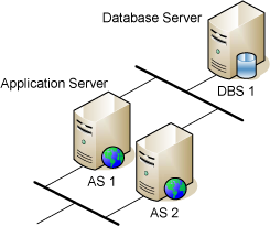 The figure below shows a simple HA cluster with two application servers and one database server. The database server is not redundant, but it would be possible to use one of the application servers as a redundant database server. The router that switches between application server 1 and application server 2 is not shown here.