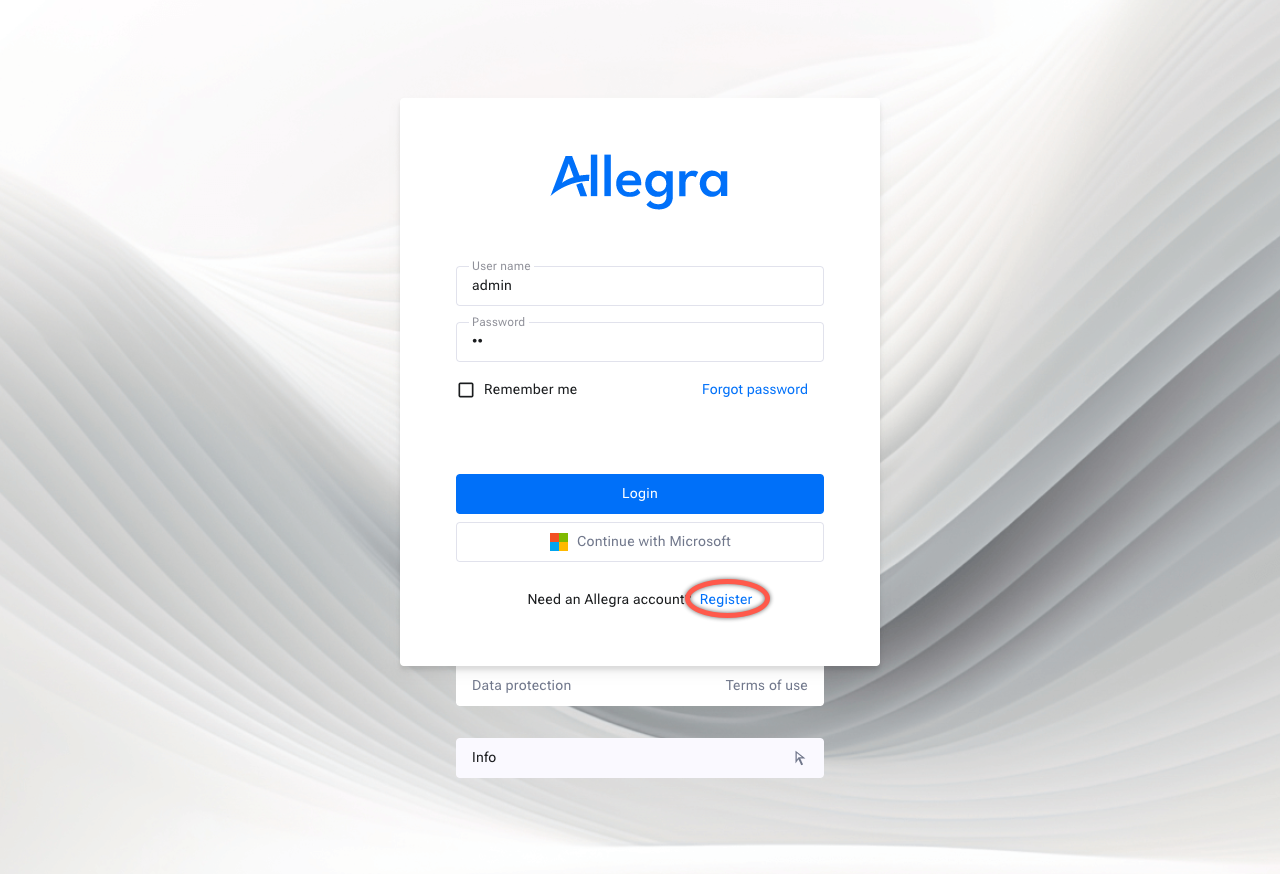 To work with Allegra, you need an account for the system. Depending on how your installation is set up, you get this account from a system administrator, are already automatically registered through synchronization with a directory server, or you have to register yourself.