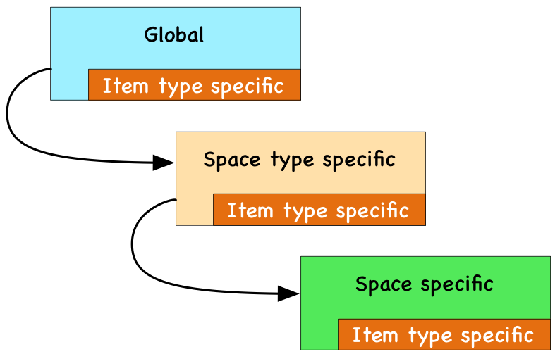 At the global level, the configuration entities can be configured either for all item types or specifically for some item types. The same applies to the workspace type level and the workspace level.